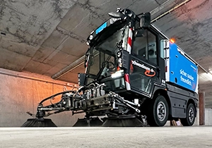 Zufahrtsstrassen, Parkplätze und Areale reinigen wir mit Wischmaschine und elektrischem Laubbläser.