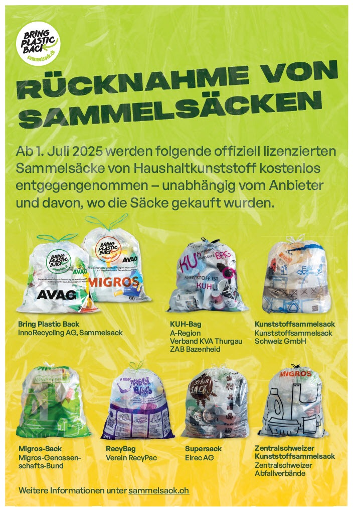 Eine lang ersehnte Änderung bei der Rücknahme von Kunststoffsammelsäcken ist endlich da. Ab sofort werden auf den Verkaufsstellen alle im Bild unten gezeigten Sammelsäcke kostenlos entgegengenommen, egal, wo die Säcke gekauft wurden.