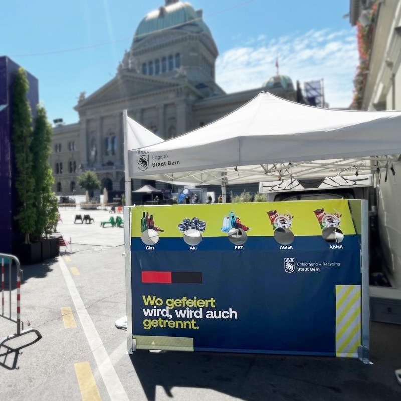 Kürzlich geliefert und schon setzt Entsorgung + Recycling der Stadt Bern gerade jetzt anlässlich der Women’s Euro 2025 unser cleveres Trennsystem mit individuell gestaltbarer Blache auf dem Bundesplatz und weiteren gut besuchten Locations ein.
