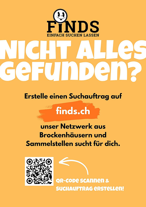 FINDS ist unsere neue Plattform für gezielte Suchaufträge nach Secondhand-Gegenständen. Du teilst uns mit, was du suchst, und wir halten für dich Ausschau danach. Sobald wir dein Wunschobjekt finden, melden wir uns bei dir. So geben wir gut erhaltenen Gegenständen ein zweites Leben. https://finds.ch/