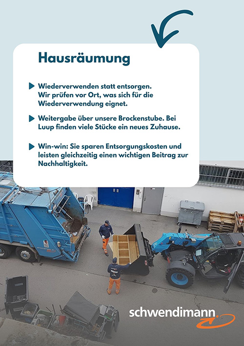 Auch bei Hausräumungen werden oft gut erhaltene Schätze entsorgt, obwohl sie noch in gutem Zustand sind und weiterverwendet werden könnten. Auch hier arbeitet die Firma Schwendimann eng mit der Luup Brocki in der Lorraine zusammen. Der Grundgedanke ist, möglichst viele Gegenstände zu retten und weiterzugeben. So werden Nachhaltigkeit und Kreislaufwirtschaft in den Vordergrund gestellt und jeder kann einen Beitrag dazu leisten.