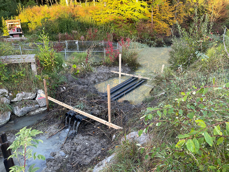 Ein clever eingebautes Rohr reguliert den Wasserstand und schützt Wege, Wiesen und Flächen vor Überschwemmung.